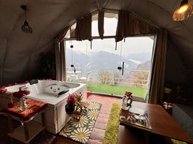 Ideal for people looking for ultimate luxury experience, a unique stay with all amenties like panaromic view, Electric Blankets, Sofa and lounge inside room, Room Heater available on request, 180 degree wide view of Dhauladhar Snow peaks, access to WiFi, bonfire, and private balcony included.